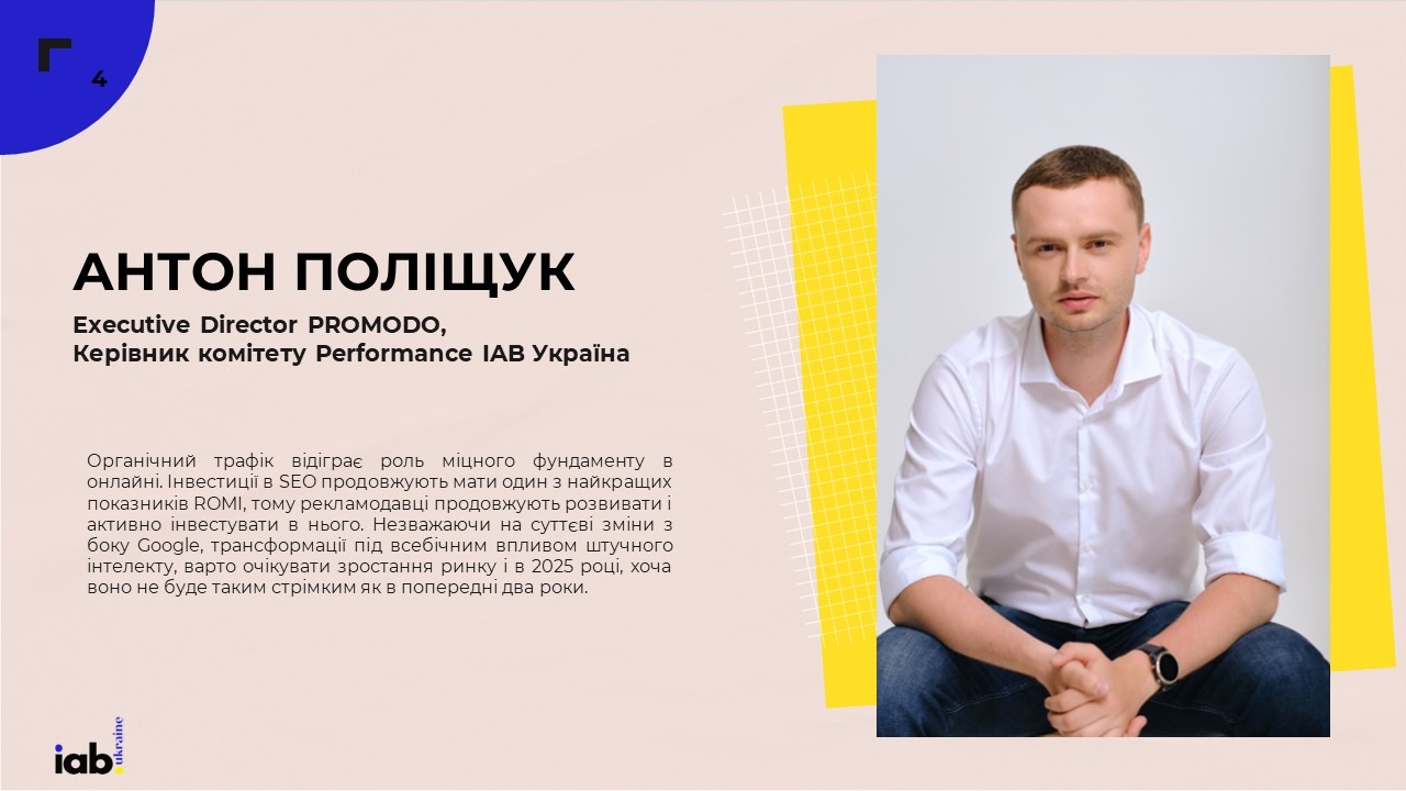 “Органічний трафік відіграє роль міцного фундаменту в онлайні. Інвестиції в SEO продовжують мати один з найкращих показників ROMI, тому рекламодавці продовжують розвивати і активно інвестувати в нього. Незважаючи на суттєві зміни з боку Google, трансформації під всебічним впливом штучного інтелекту, варто очікувати зростання ринку і в 2025 році, хоча воно не буде таким стрімким як в попередні два роки”, – коментує Антон Поліщук, Executive Director Promodo, Керівник комітету Performance IAВ Україна.